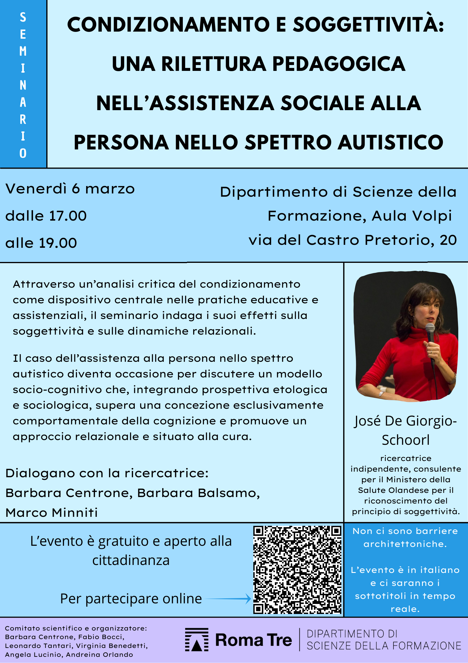 Venerdì 6 marzo 2026, dalle ore 17.00 alle ore 19.00, presso il Dipartimento di Scienze della Formazione (Aula Volpi - Via del Castro Pretorio), si terrà un seminario di studi dal titolo “Condizionamento e soggettività: una rilettura pedagogica nell’assistenza sociale alla persona nello spettro autistico”.