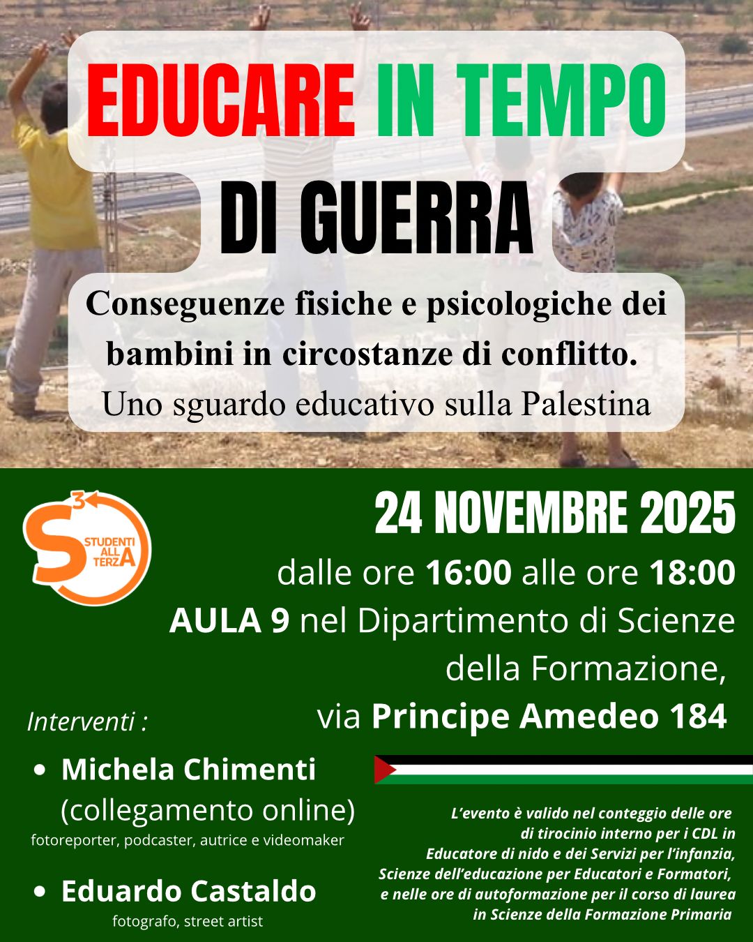 Il Dipartimento di Scienze della Formazione invita a partecipare all'evento Educare in tempo di guerra. Conseguenze fisiche e psicologiche dei bambini in circostanze di conflitto. Uno sguardo educativo sulla Palestina.