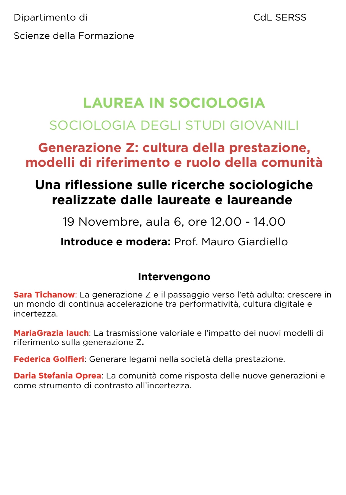 Generazione Z: cultura della prestazione, modelli di riferimento e ruolo della comunità 19 novembre ore 12.00-14.00 aula 6 Polo didattico.
