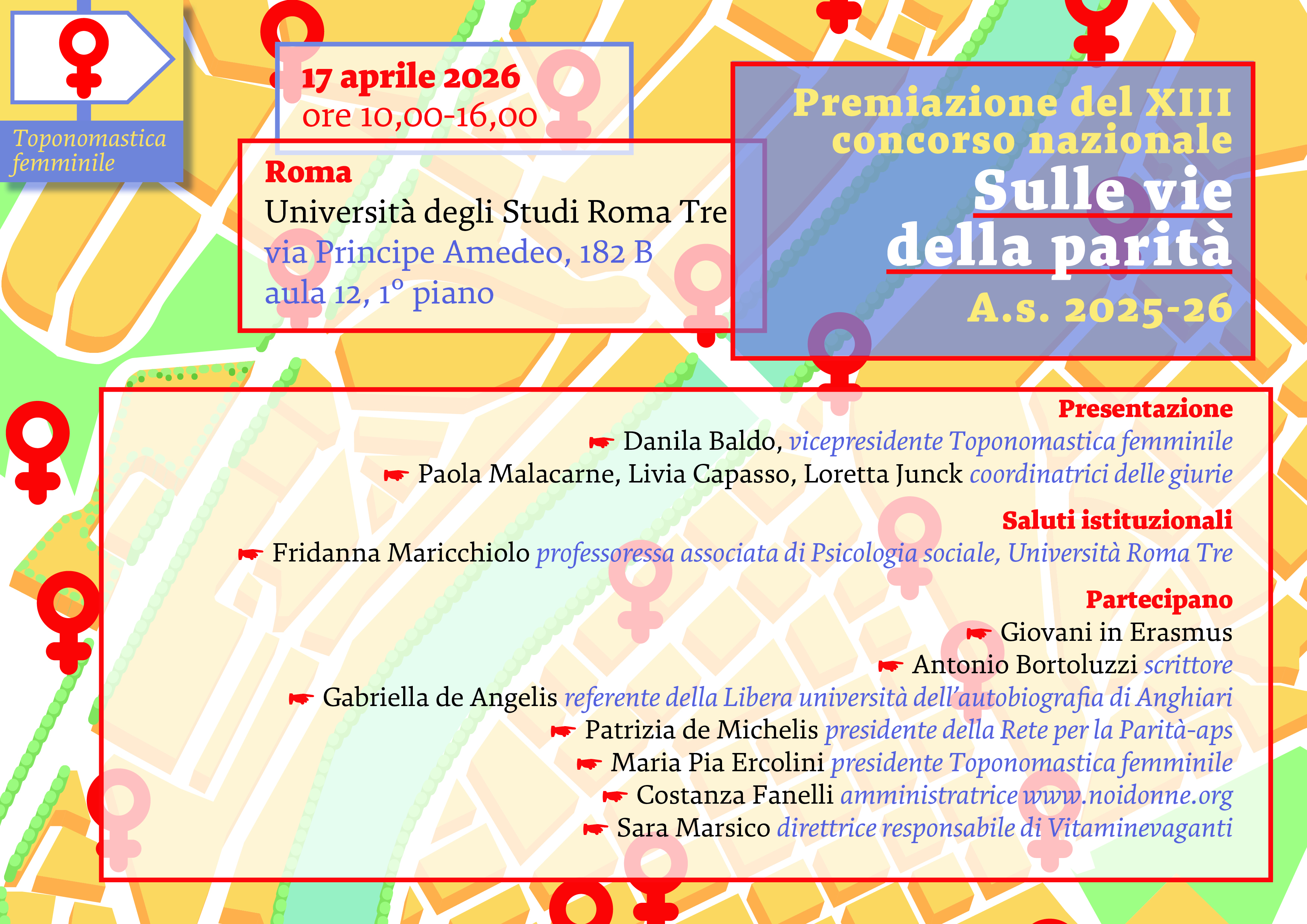 Venerdì 17 aprile 2026, dalle ore 10.00 alle 16.00, presso il Dipartimento di Scienze della Formazione dell’Università Roma Tre (Polo Didattico di via Principe Amedeo 182, Aula 12, I piano), si terrà la cerimonia di premiazione della XIII edizione del concorso nazionale “Sulle Vie della Parità”, promosso dall’Associazione Toponomastica Femminile.