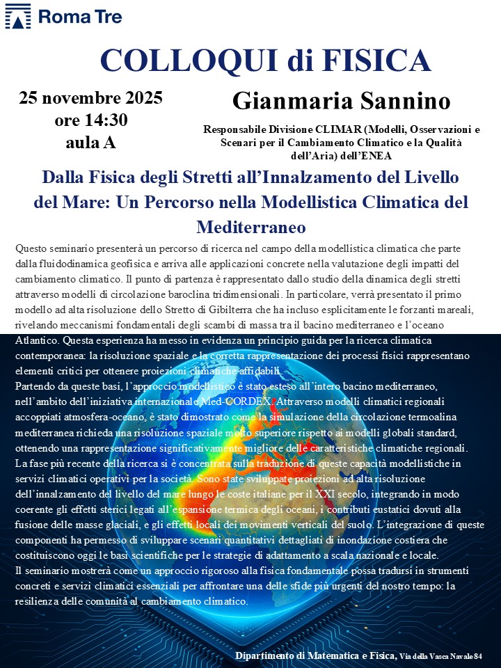 Martedì 25 novembre 2025 alle ore 14:30, il Prof. Gianmaria Sannino Responsabile Divisione CLIMAR (Modelli, Osservazioni e Scenari per il Cambiamento Climatico e la Qualità dell’Aria) dell’ENEA terrà il Colloquio di Fisica dal titolo "Dalla Fisica degli Stretti all’Innalzamento del Livello del Mare: Un Percorso nella Modellistica Climatica del Mediterraneo".
