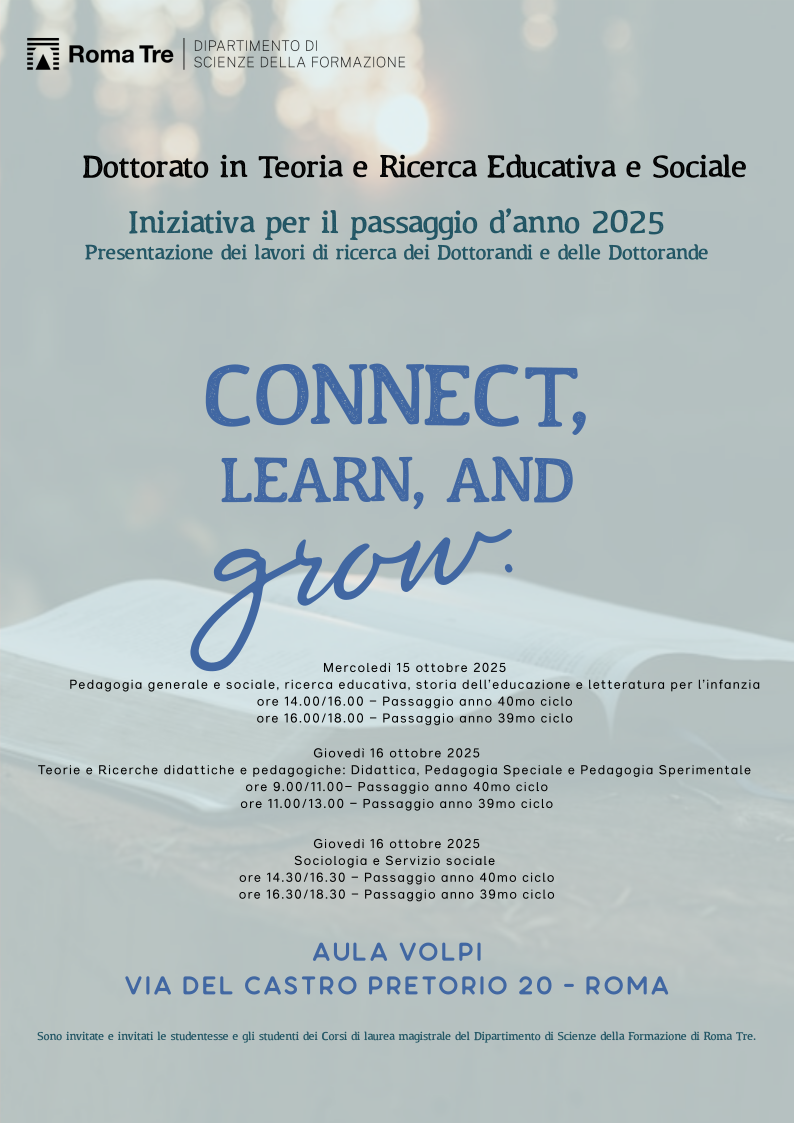 Il 15 e il 16 ottobre 2025, presso il Dipartimento di Scienze della Formazione (Aula Volpi - Via del Castro Pretorio, 20), si terrà per gli studenti dei Corsi di Laurea Magistrale l'iniziativa Connect, Learn and Grow promossa dal Dottorato in Teoria e Ricerca Educativa e Sociale per il passaggio di anno 2025.