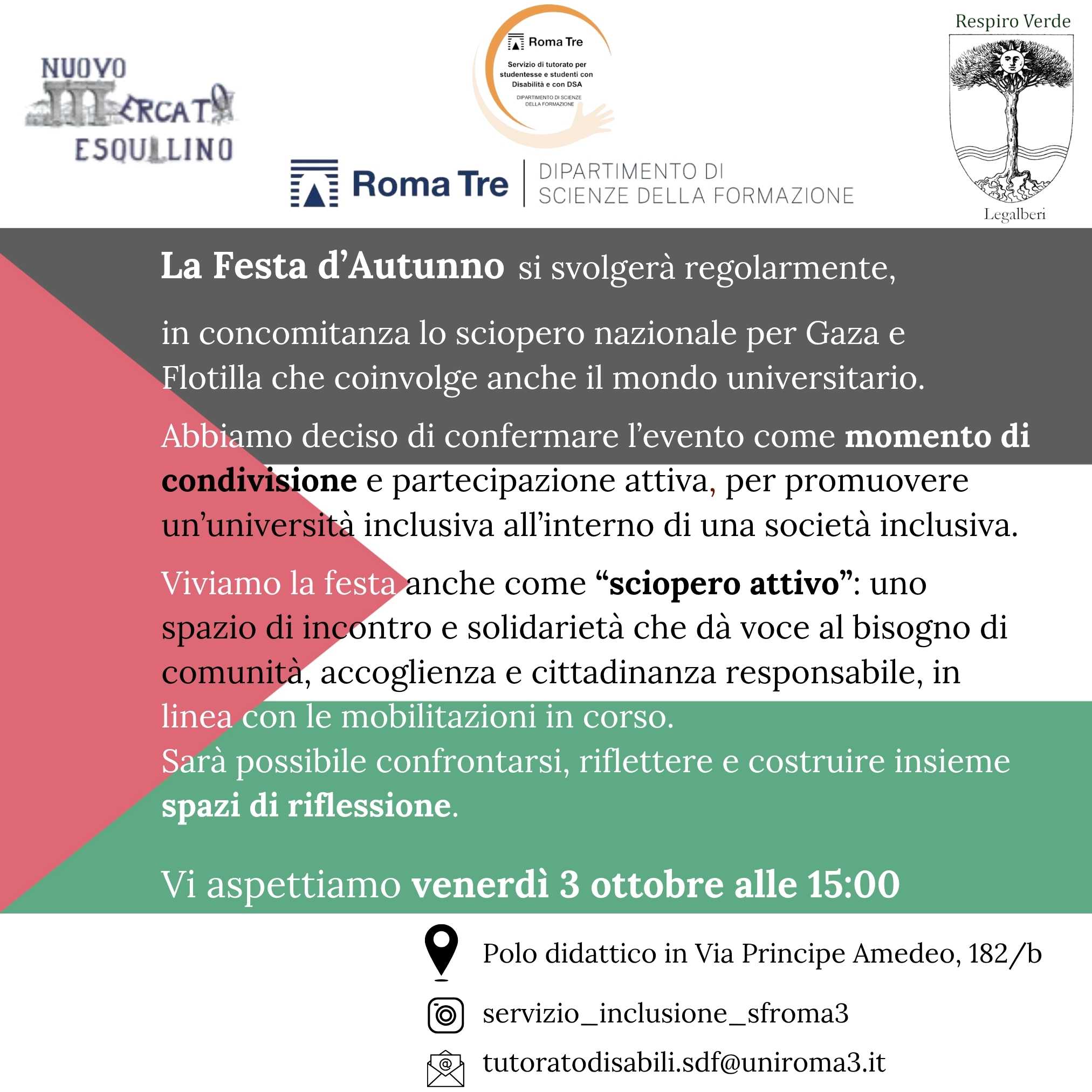 L'ufficio Tutorato per studenti con disabilità e DSA del Dipartimento di Scienze della Formazione invita tutti gli studenti a partecipare alla Festa d'Autunno che si terrà venerdì 3 ottobre 2025 a partire dalle ore 15.00 presso il Polo Didattico del Dipartimento (via Principe Amedeo, 182b - Roma).