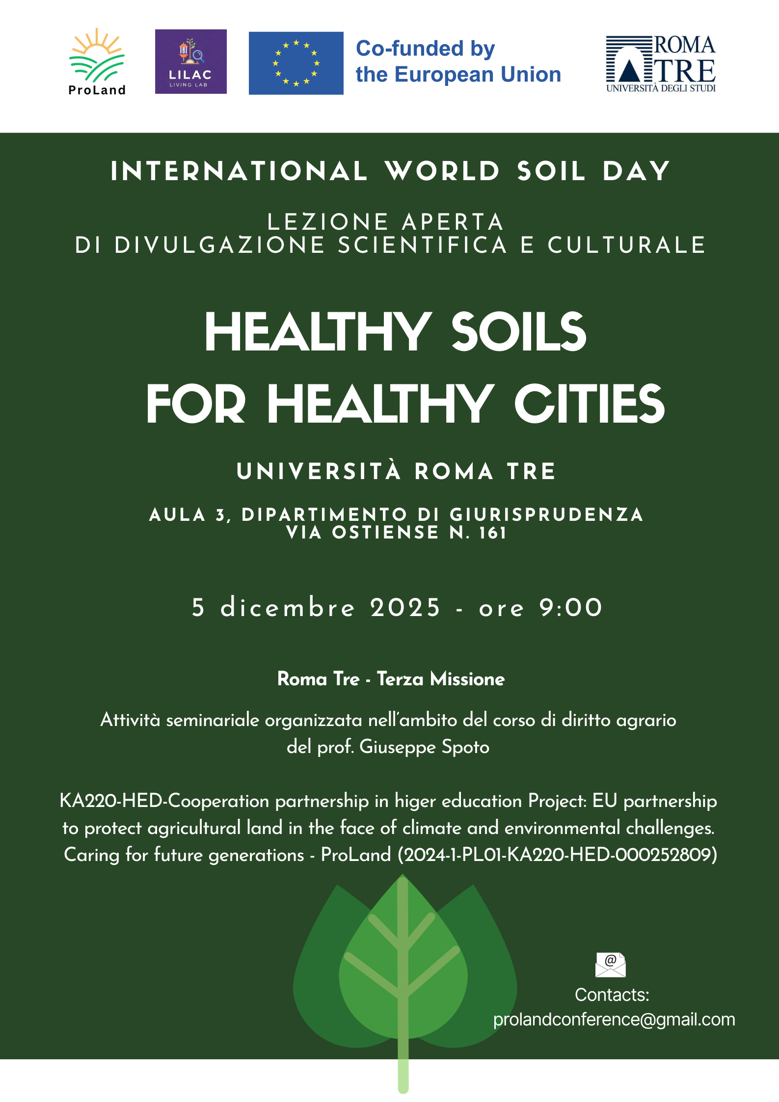 In occasione dell’International World Soil Day, nell’ambito del corso di Diritto Agrario tenuto dal prof. Giuseppe Spoto, si svolgerà il seminario “Healthy Soils for Healthy Cities”.