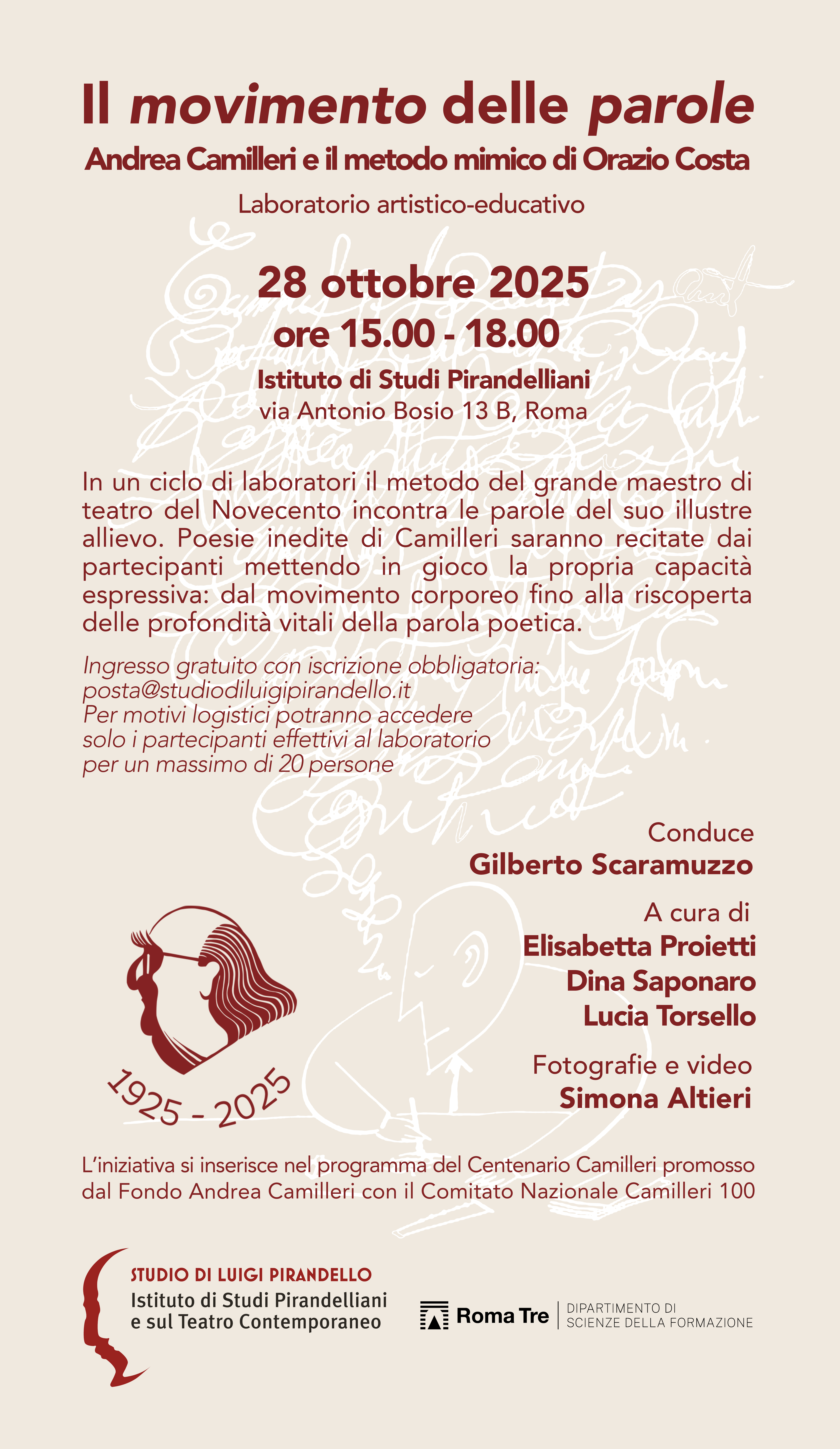Sarà l’Istituto di Studi Pirandelliani e sul Teatro Contemporaneo, che fu casa romana di Luigi Pirandello e dove è custodito il suo studio, a ospitare il laboratorio del ciclo “Il movimento delle parole. Andrea Camilleri e il metodo mimico di Orazio Costa”.