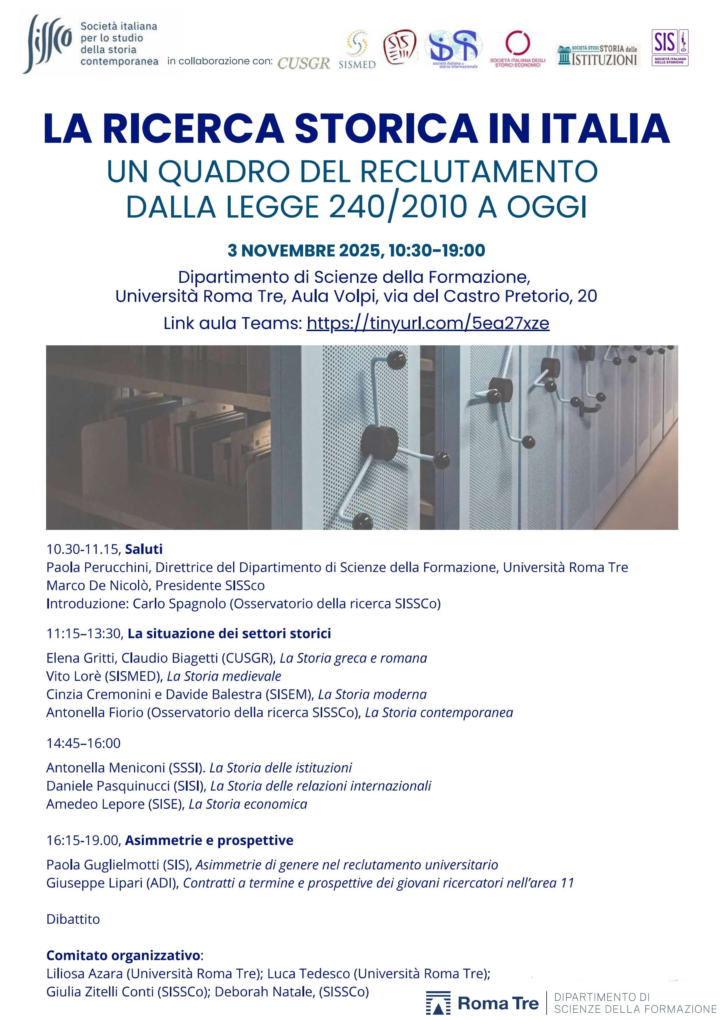 Lunedì 3 novembre 2025, dalle ore 10.30 alle ore 19.30, presso l'aula Volpi del Dipartimento di Scienze della Formazione (Via del Castro Pretorio 20), si terrà il convegno "La ricerca storica in Italia. Un quadro di reclutamento dalla legge 240/2010 a oggi".