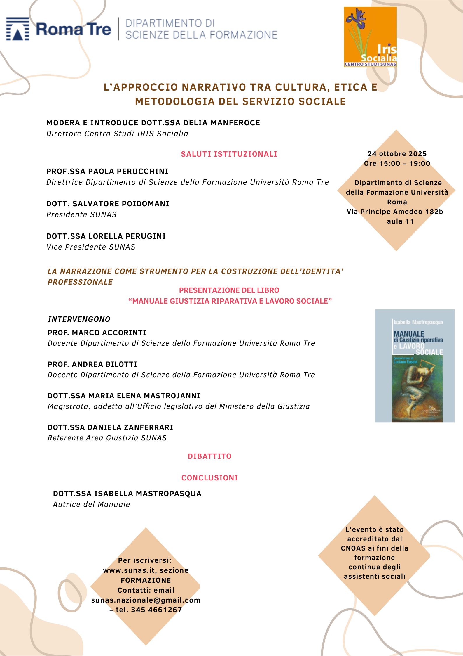 Venerdì 24 ottobre 2025, dalle ore 15:00 alle ore 19:00, presso il Dipartimento di Scienze della Formazione (Aula 11 - Via Principe Amedeo, 182b), si terrà il convegno dal titolo "L'approccio narrativo tra cultura, etica e metodologia del servizio sociale".