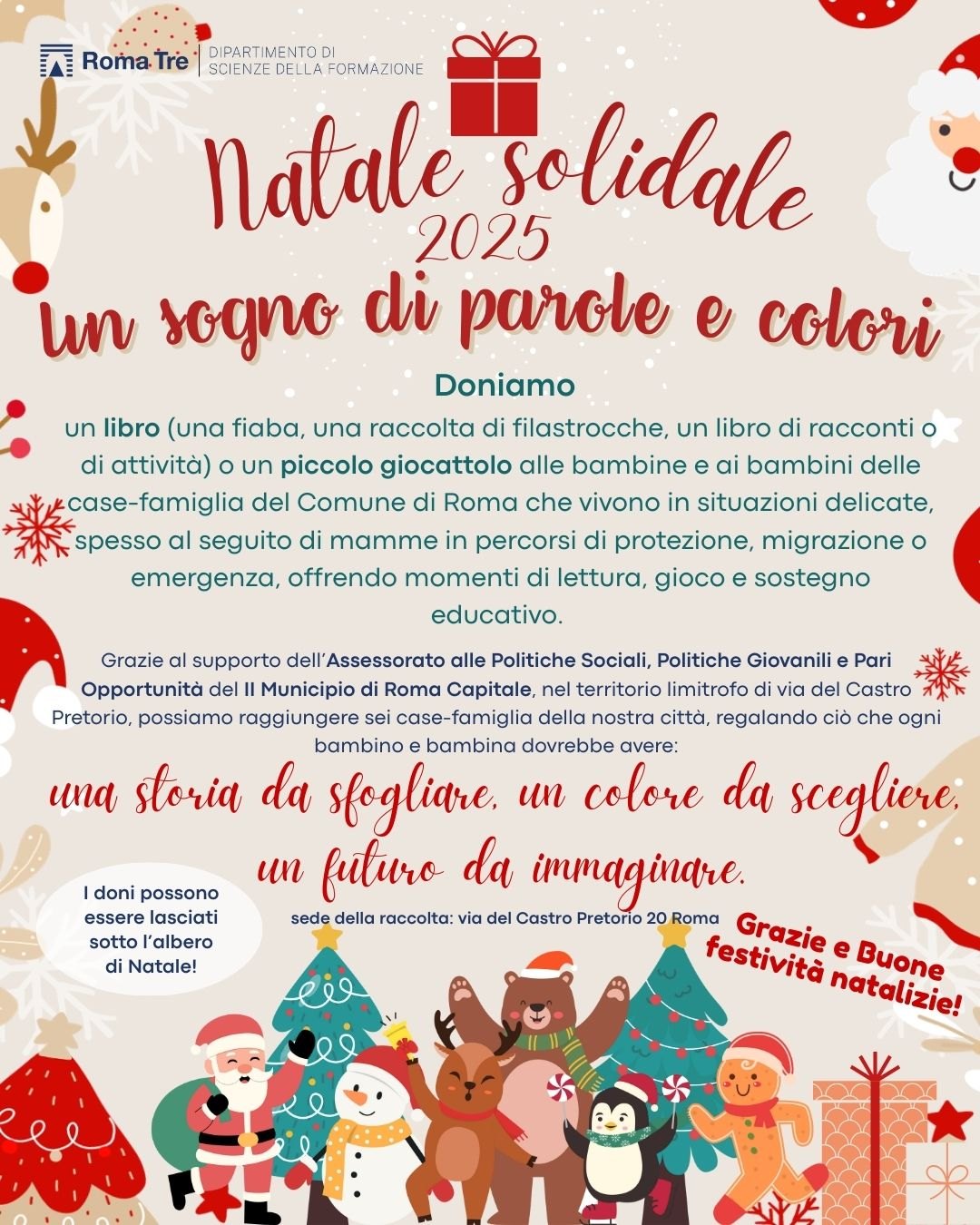 In occasione delle festività natalizie, il Dipartimento di Scienze della Formazione promuove l'iniziativa solidale "Natale Solidale 2025 - Un sogno di parole e colori", un progetto che invita la comunità accademica e i cittadini a contribuire con donazioni di libri per l'infanzia e piccoli giochi da destinare ai bambini e alle bambine ospitati nelle Case-Famiglia del Comune di Roma.