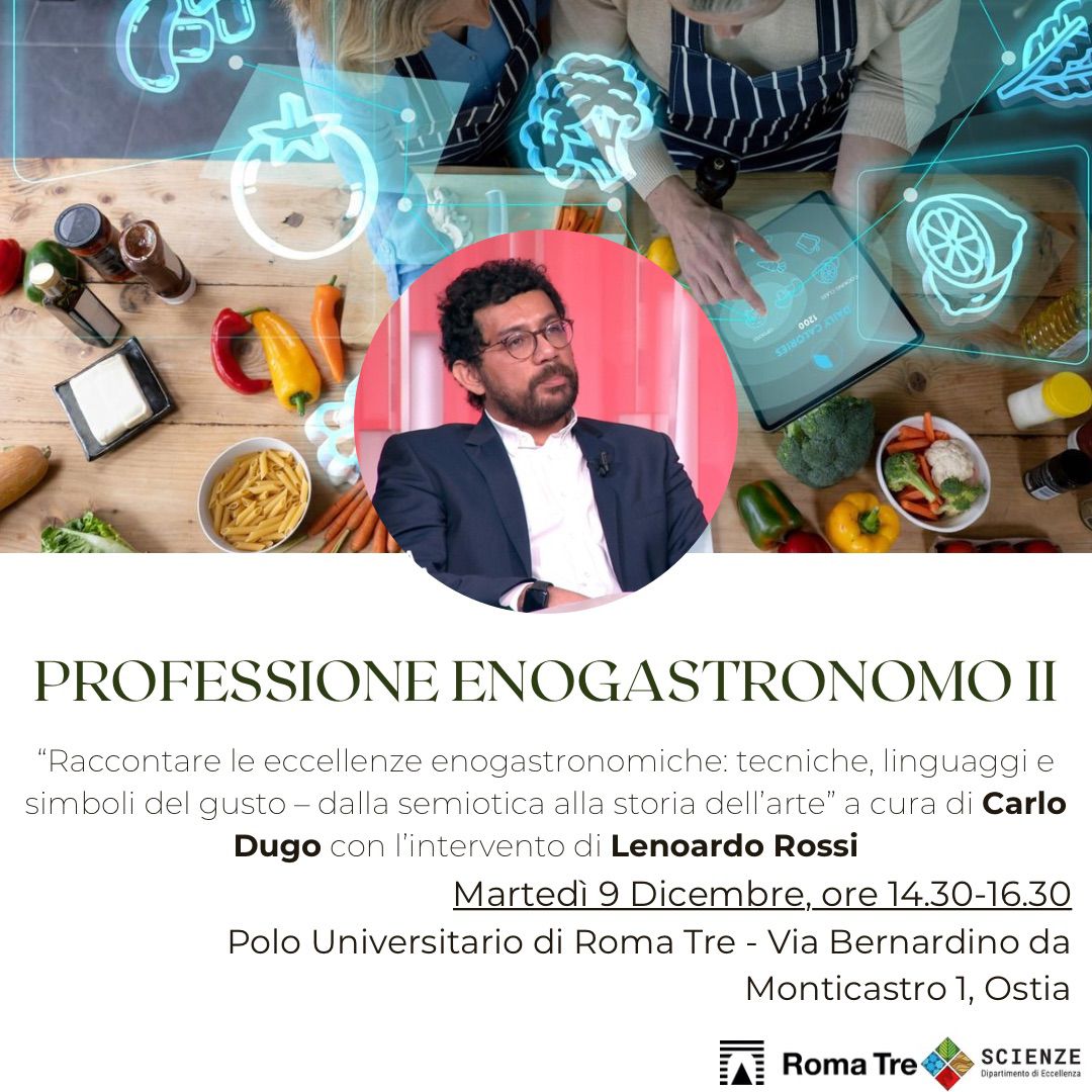 Martedì 9 dicembre, nell’ambito dell’insegnamento Professione enogastronomo II, si terrà il seminario Raccontare le eccellenze enogastronomiche: tecniche, linguaggi e simboli del gusto – dalla semiotica alla storia dell’arte, presso il polo universitario di Roma Tre ad Ostia, alle ore 14:30, in aula 3.