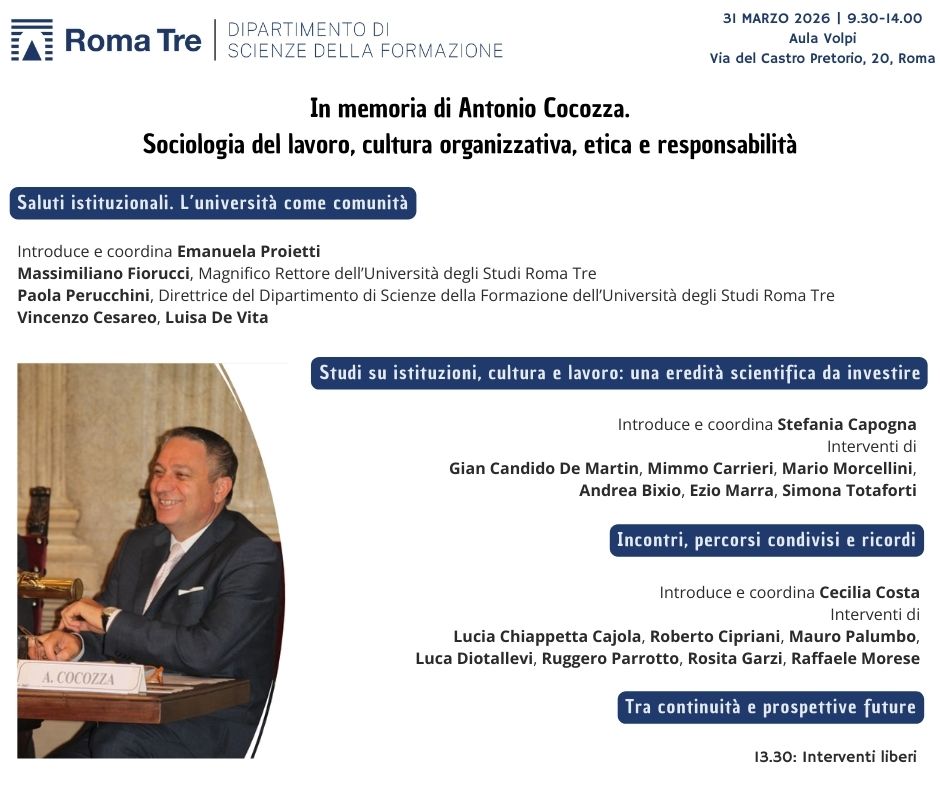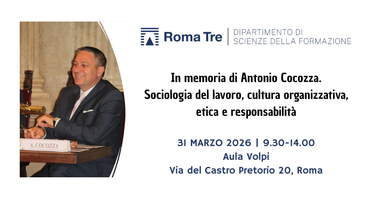 Martedì 31 marzo 2026, dalle ore 09:30 alle ore 14:00, presso l'Aula Volpi del Dipartimento di Scienze della Formazione (via del Castro Pretorio 20), si terrà una giornata di studio, incontri e testimonianze dedicata alla memoria del Prof. Antonio Cocozza.