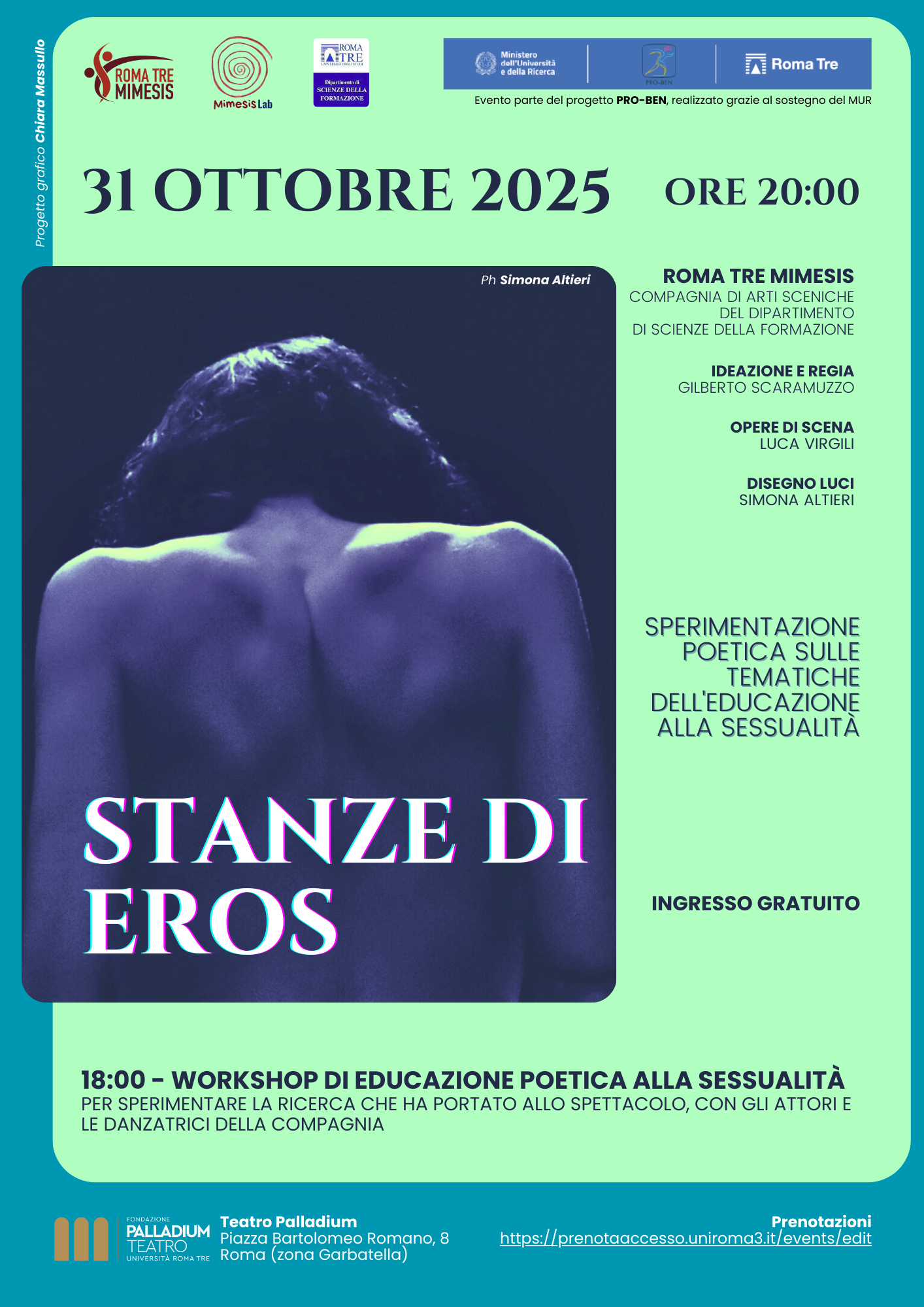 Stanze di Eros. Una sperimentazione poetica sulle tematiche dell’educazione alla sessualità è un progetto curato dalla Roma Tre Mimesis – Compagnia di Arti Sceniche del Dipartimento di Scienze della formazione in collaborazione con il MimesisLab – Laboratorio di Pedagogia dell’Espressione, sotto il coordinamento del prof. Gilberto Scaramuzzo.